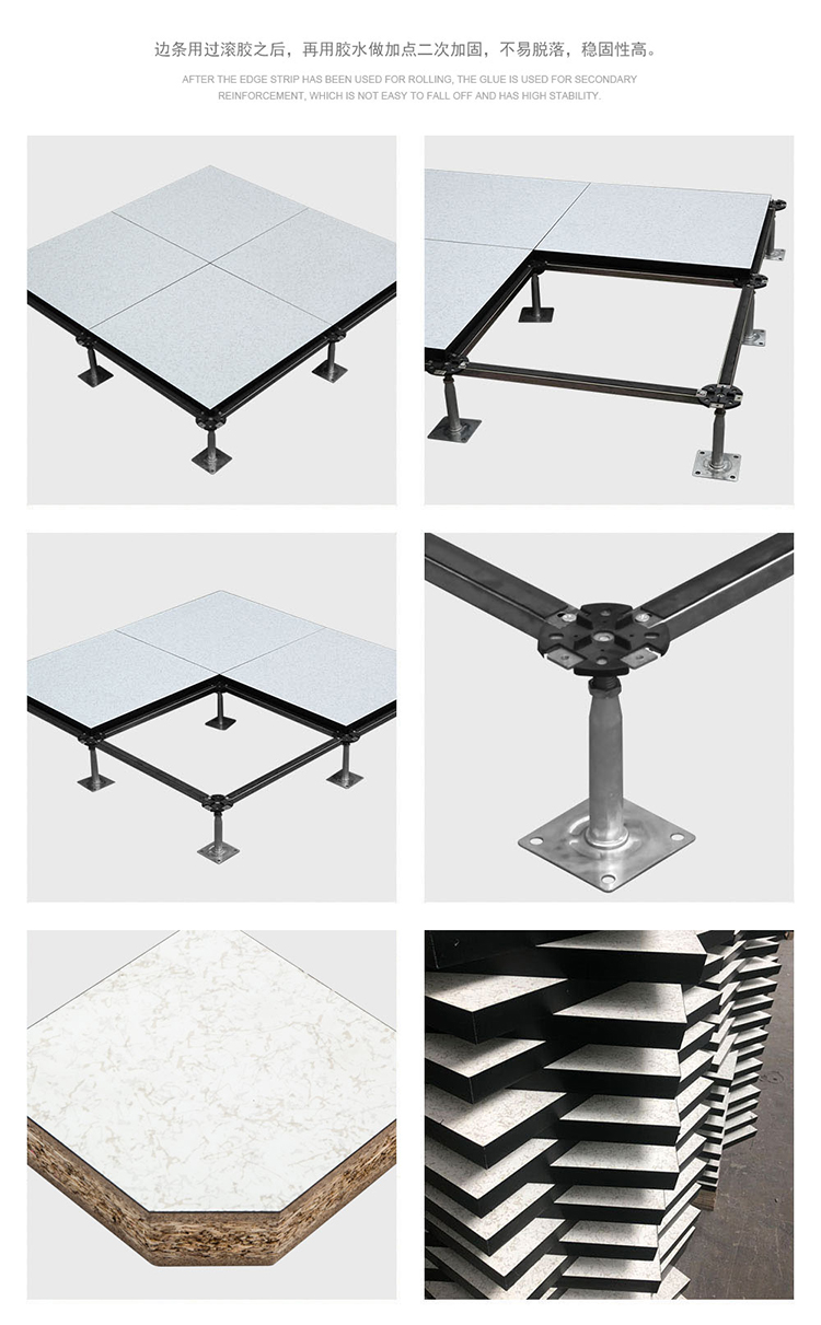 歐式復(fù)合地板,板芯采用、未經(jīng)加工的中高密度刨花板基,上面粘貼HPL(防火板)、PVC、陶瓷、等不同裝飾面層,下面粘貼鍍鋅鋼板/鋁板/鋁箔,四周導(dǎo)靜電黑膠條封邊,阻止機械損壞及潮濕變形。通過阻燃劑的添加,使其達到B1級防火,且具有較輕的自重,達到更高的承載能力和環(huán)保水平,標(biāo)配出口型加重配件。