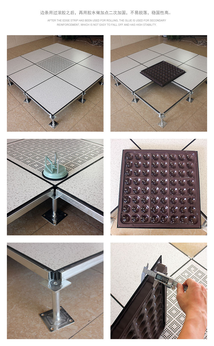 全鋼防靜電地板為全鋼組件,分有邊、無(wú)邊、微邊(三種邊處理方式)。底面采用SPCC深沖冷軋板拉伸成型鋼板厚度(0.4~1.5mm),球窩狀結(jié)構(gòu),增加地板的機(jī)械荷載強(qiáng)度。面板采用硬質(zhì)SPCC鋼板(0.5~2.0mm),上下經(jīng)過(guò)點(diǎn)焊焊接成型,切邊沖孔后,經(jīng)防銹處理,環(huán)氧樹(shù)脂粉末靜電噴涂后,中間填充發(fā)泡水泥(可以根據(jù)客戶(hù)需求發(fā)泡不同重量),再經(jīng)過(guò)日曬養(yǎng)護(hù)后形成穩(wěn)定的承載結(jié)構(gòu)。地板上表層粘貼防火板(HPL)/復(fù)合PVC/ 通體PVC/陶瓷地磚等不同材質(zhì)的裝飾表層,達(dá)到產(chǎn)品花色的多樣性、可以根據(jù)客戶(hù)需求個(gè)性化定制產(chǎn)品。搭配聯(lián)網(wǎng)支架、支架、螺釘組裝后,定位聯(lián)接更加準(zhǔn)確、精度可靠。